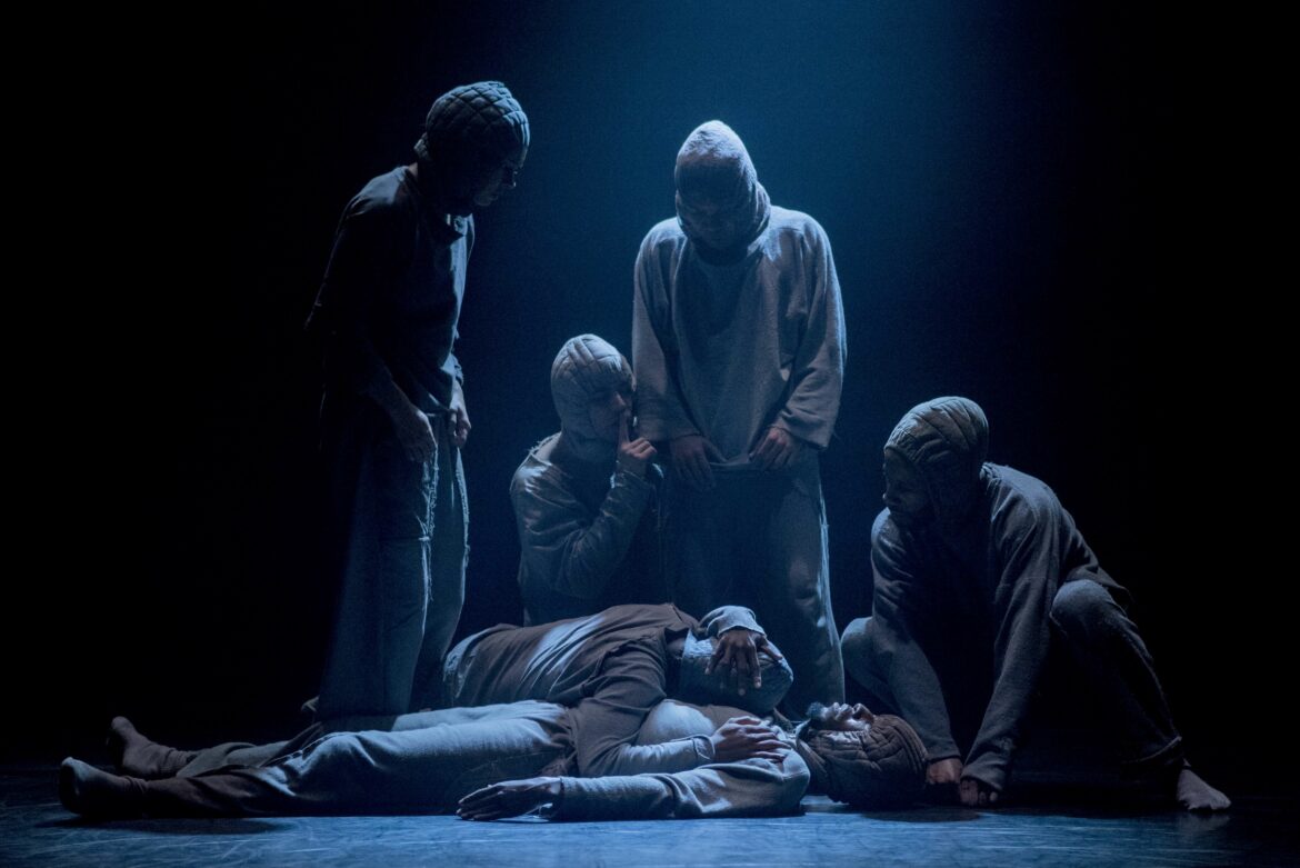 J’ai pu le découvrir pour la première fois au Luxembourg avec BLKDOG, à l’affiche du Grand Théâtre. Six interprètes incarnent un échantillon d’humanité qui semble plongée au fond d’un trou noir dont ils ne peuvent s’échapper. Cagoule sur la tête. Tuniques amples qui masquent les corps – leurs couleurs et leurs genres. Une atmosphère oppressante jusqu’aux rangs des spectateurs.